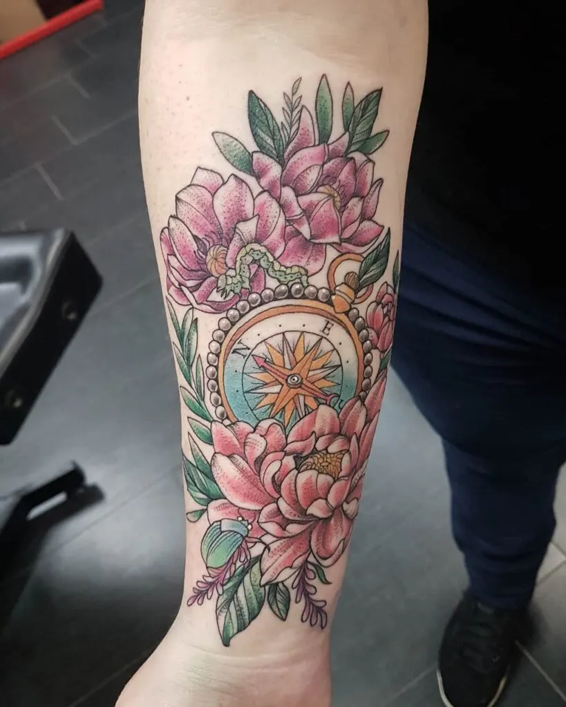 This stunning forearm tattoo features a colorful compass surrounded by bold pink blossoms and lush greenery. The floral elements add softness and femininity, while the compass remains the centerpiece, symbolizing navigation and guidance. The intricate beaded detailing around the compass enhances its ornamental beauty.