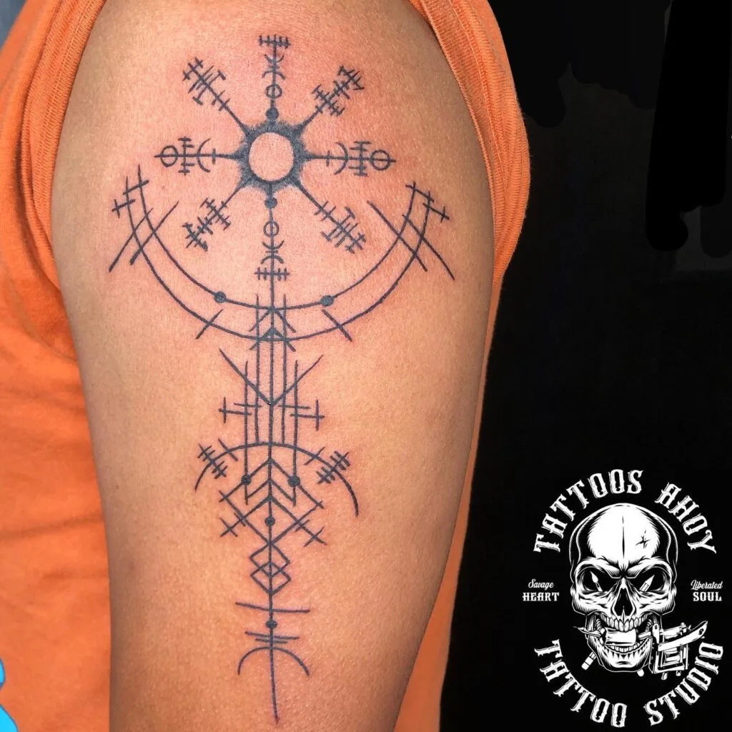 This intricate tattoo draws inspiration from Norse symbolism, resembling the Vegvisir, a Viking compass believed to guide through rough journeys. Placed on the upper arm, it features geometric lines, intersecting arrows, and rune-like details, giving it a mystical and ancient aesthetic.