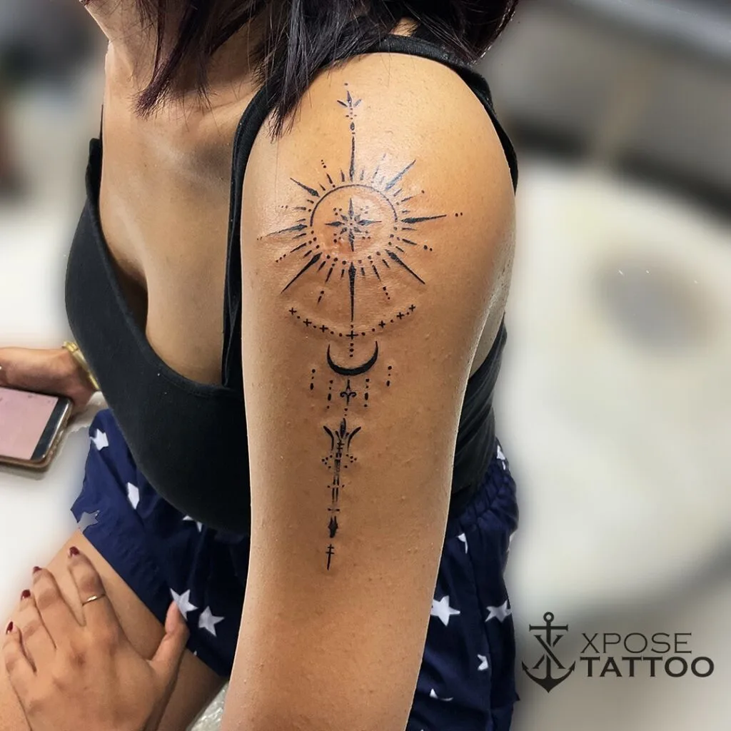 This tattoo radiates elegance and mysticism with a compass designed like a celestial starburst. Geometric lines, dots, and a crescent moon beneath the compass give it a spiritual, cosmic feel. The placement on the upper arm enhances its graceful vertical flow.
