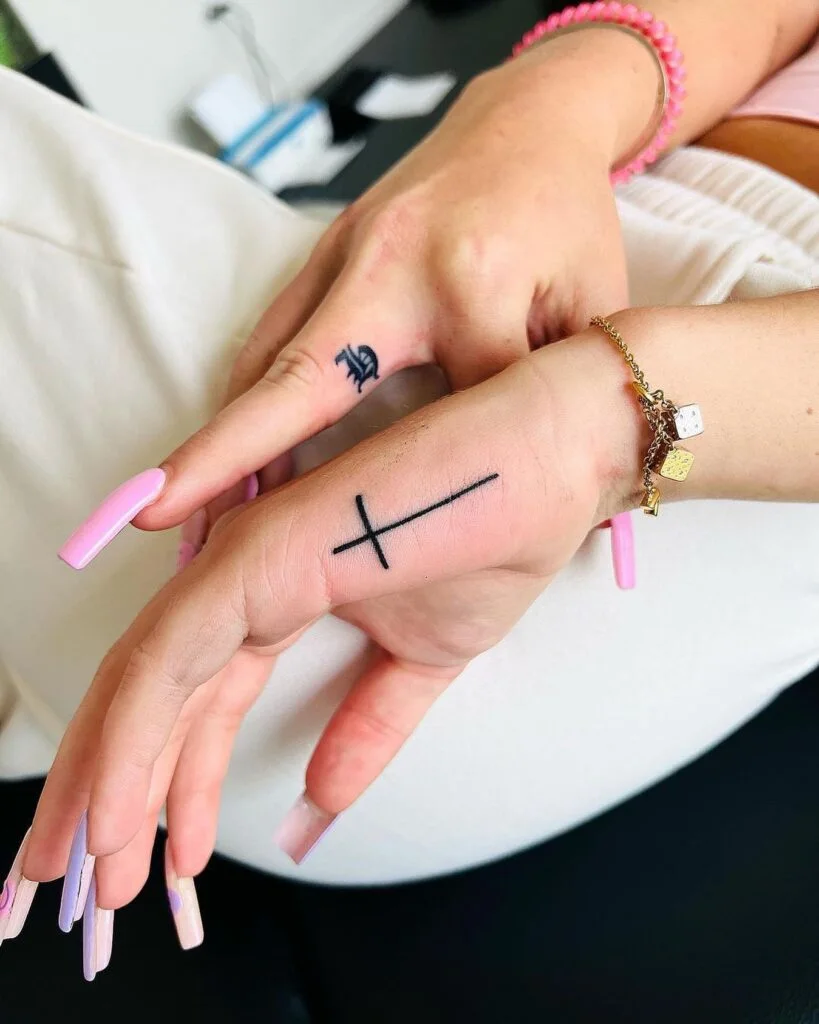 This simple cross tattoo placed along the side of the hand carries deep spiritual meaning with a modern, minimalistic approach. Its clean lines and bold black ink make it striking yet understated, perfect for women who want their faith represented in an elegant way.