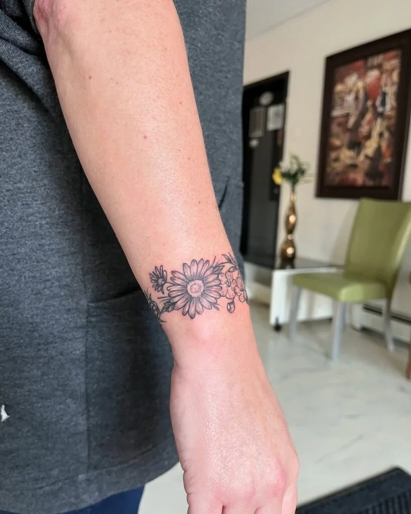This dainty daisy tattoo, wrapped beautifully around the wrist, represents purity, innocence, and joy. The fine line detailing and delicate shading create a realistic floral band that feels feminine and timeless.