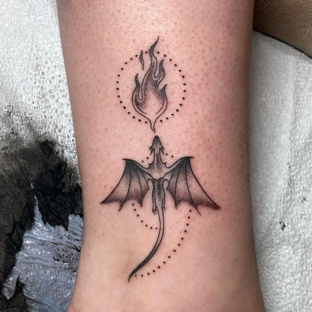 This intricate dragon tattoo captures the mystical essence of strength and transformation. The dragon, with its wings spread and body curved, breathes fire into a dotted halo, symbolizing energy, courage, and fierce protection. Placed on the skin with delicate shading, the design radiates both power and elegance.