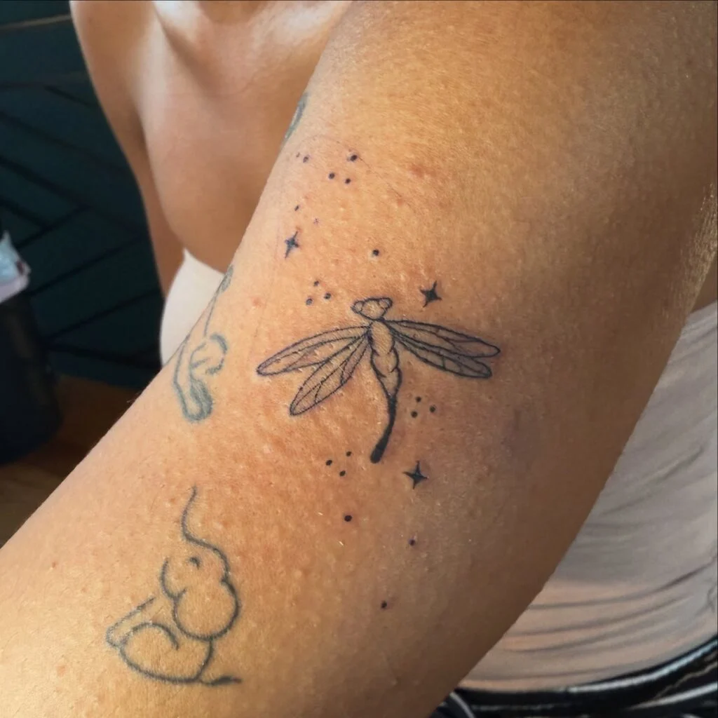 This enchanting dragonfly tattoo surrounded by tiny stars creates a design full of wonder and symbolism. Dragonflies are often seen as messengers of change, light, and adaptability, making them a meaningful tattoo choice for women embracing transformation.