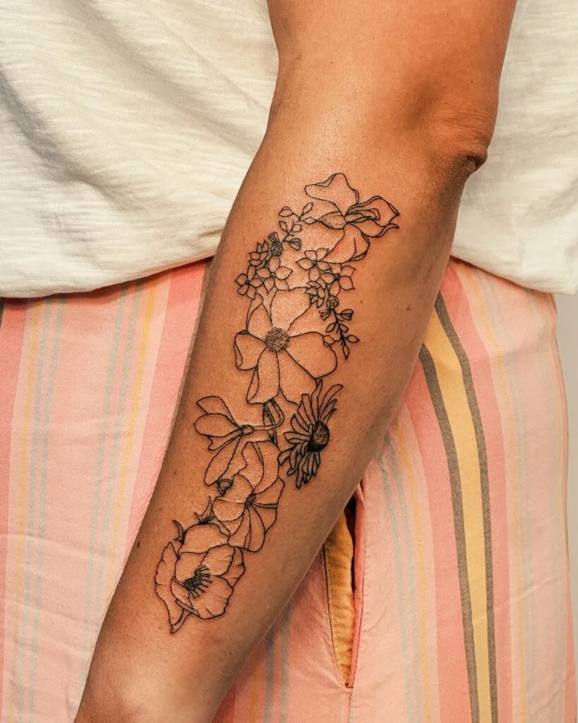 The arrangement flows beautifully down the arm, creating a natural, elegant look that enhances the skin like wearable art. Its intricate details highlight the beauty of each petal and stem, celebrating growth and connection to nature. A floral tattoo like this serves as a timeless reminder of strength in diversity and the beauty of blooming in one’s own way. Feminine, bold, and full of meaning.
