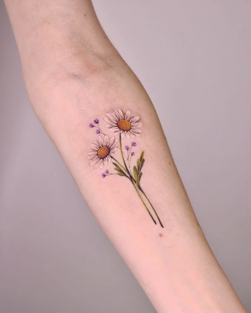 This tattoo combines two dainty daisies with sprigs of lavender, rendered in soft, natural colors. The realistic shading brings the flowers to life, creating a design that feels fresh and vibrant. Daisies symbolize innocence and joy, while lavender represents calmness and healing, making this tattoo rich with meaning.