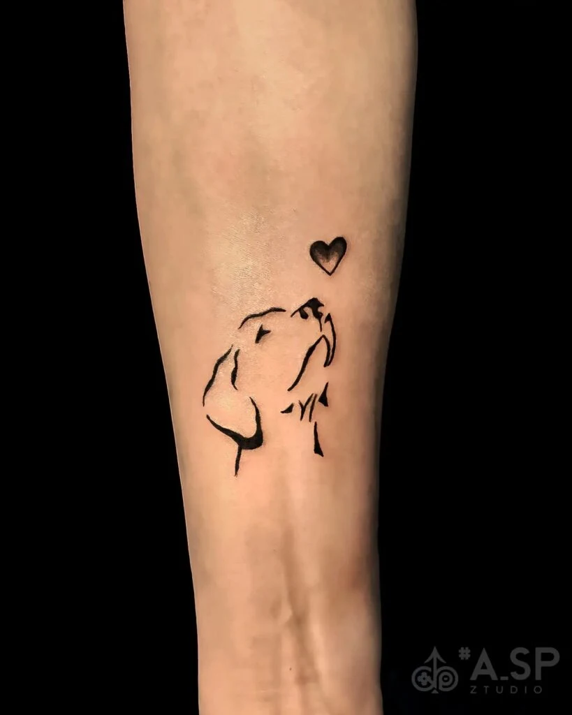 This tattoo captures the simplicity of love between human and dog through a minimalistic silhouette design. The black ink outlines form the profile of a dog gazing upwards toward a small heart, symbolizing loyalty, admiration, and connection.