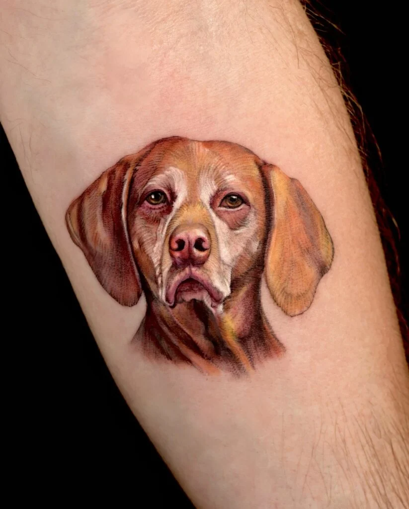 An extraordinary tattoo featuring a highly realistic portrait of a brown dog, rendered in stunning detail and lifelike color. The artist’s mastery of shading and highlights brings out the depth of the dog’s soulful eyes, soft fur, and gentle expression.