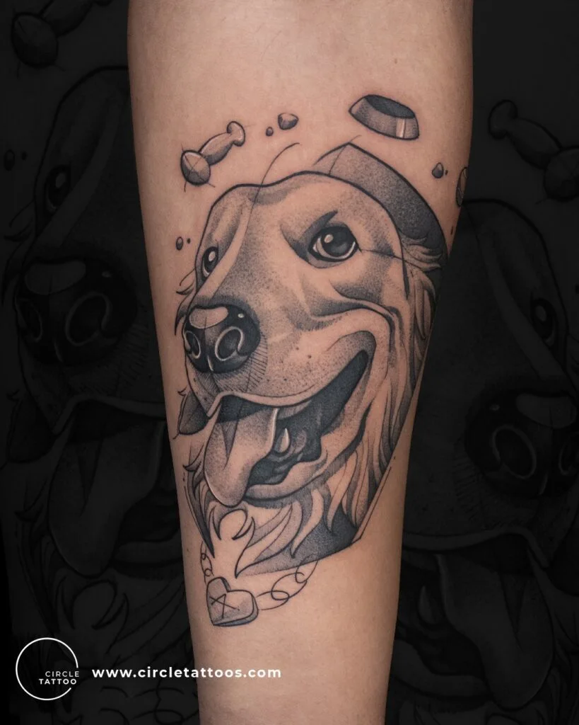 This tattoo captures the joyful spirit of a dog with a detailed black-and-grey design. The expressive eyes, open mouth, and tongue hanging out perfectly embody happiness and loyalty. Surrounding elements like a collar, tag, and playful accents enhance the character, making the piece both whimsical and heartfelt.