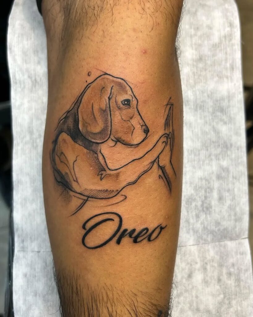 This tattoo features a sketched outline of a dog paired with the name “Oreo” written in elegant cursive below. The loose sketch lines create a soft, artistic feel, while the dog’s posture conveys curiosity and warmth.