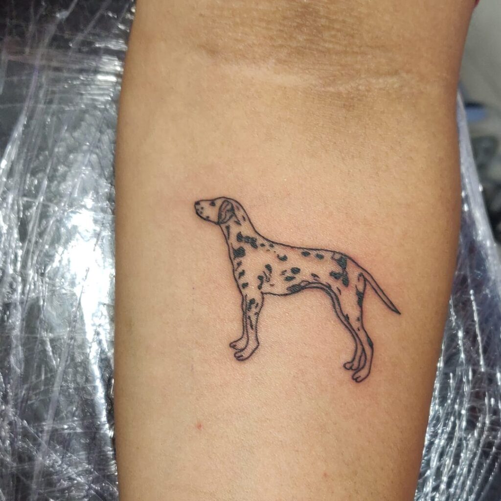This tattoo presents a standing dog in a clean, minimalist outline, detailed with distinctive spots reminiscent of a Dalmatian. Its straightforward design highlights strength, alertness, and elegance, making it perfect for someone who values subtle tattoos with character.