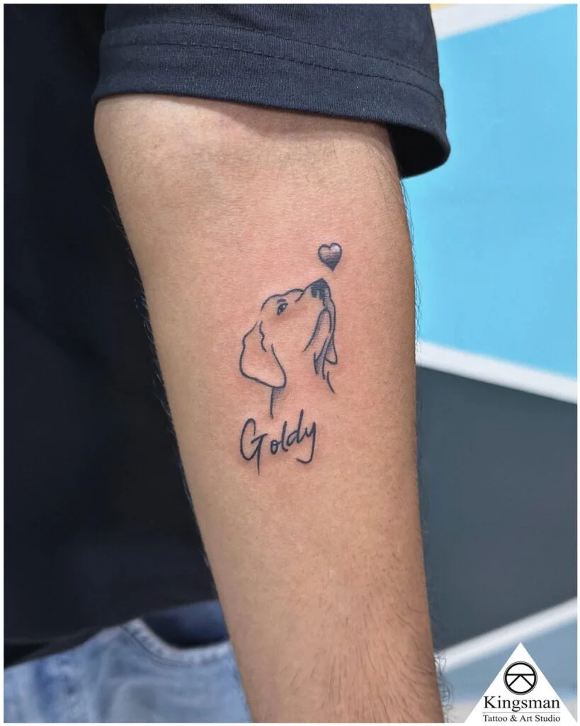 This tattoo combines simplicity and emotion in a minimal line-art style. The outline of a dog gazes upward toward a floating heart, symbolizing unconditional love and devotion. Beneath the sketch, the name “Goldy” personalizes the piece, making it a meaningful tribute to a beloved pet.