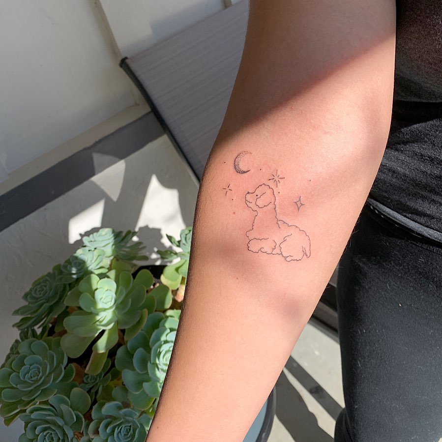 This minimalist tattoo features a fluffy pup drawn in delicate outline style, sitting peacefully under a crescent moon and twinkling stars. Its dreamy, celestial theme symbolizes guidance, loyalty, and eternal companionship.