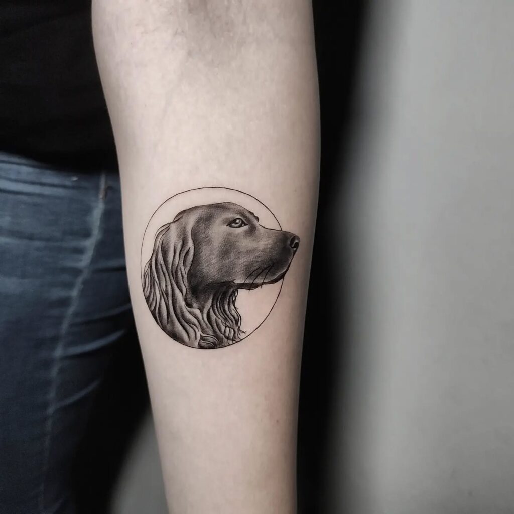 This tattoo features a beautifully shaded portrait of a dog’s head enclosed within a circle, emphasizing both realism and elegance. The artist has carefully captured the long, flowing fur and expressive eyes, giving the tattoo depth and personality.