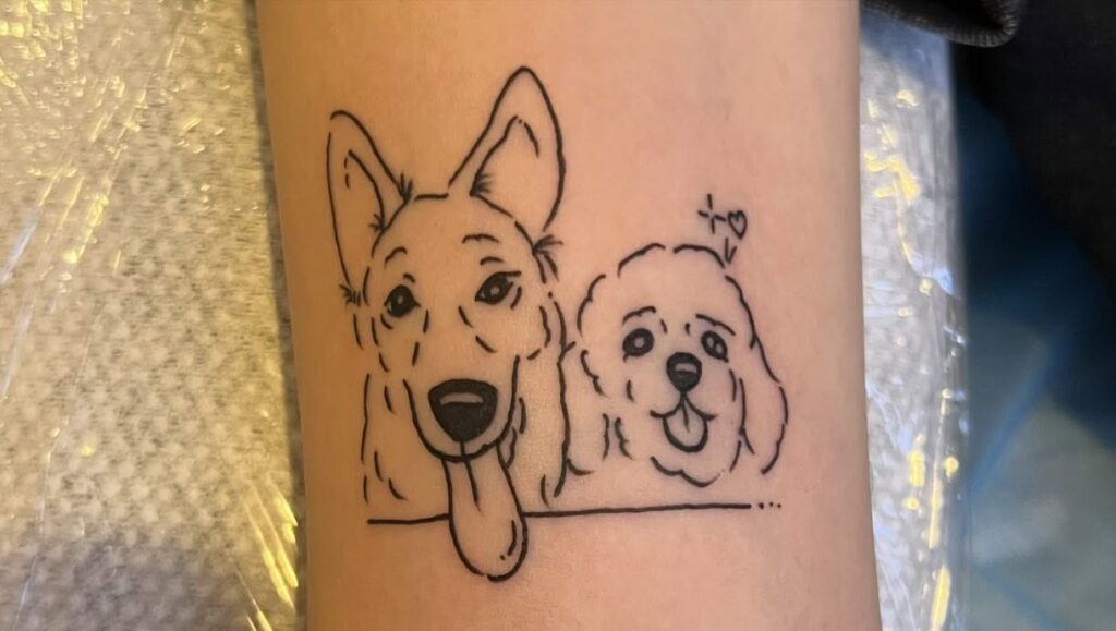 The simplicity of the outlines conveys a lighthearted spirit while still capturing personality and charm. This design beautifully symbolizes friendship, family, or multiple pets that hold special meaning. Its sketch-like quality makes it whimsical and endearing, perfect for those who want a tattoo that highlights happiness, loyalty, and the shared love of furry companions.