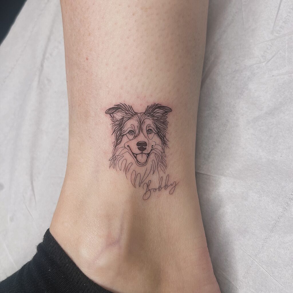 A charming line-art tattoo of a smiling dog, enhanced with the handwritten name “Bobby,” sits gracefully on the wearer’s ankle. The delicate strokes highlight the joyful personality of the dog, while the script adds a personal, heartfelt connection.