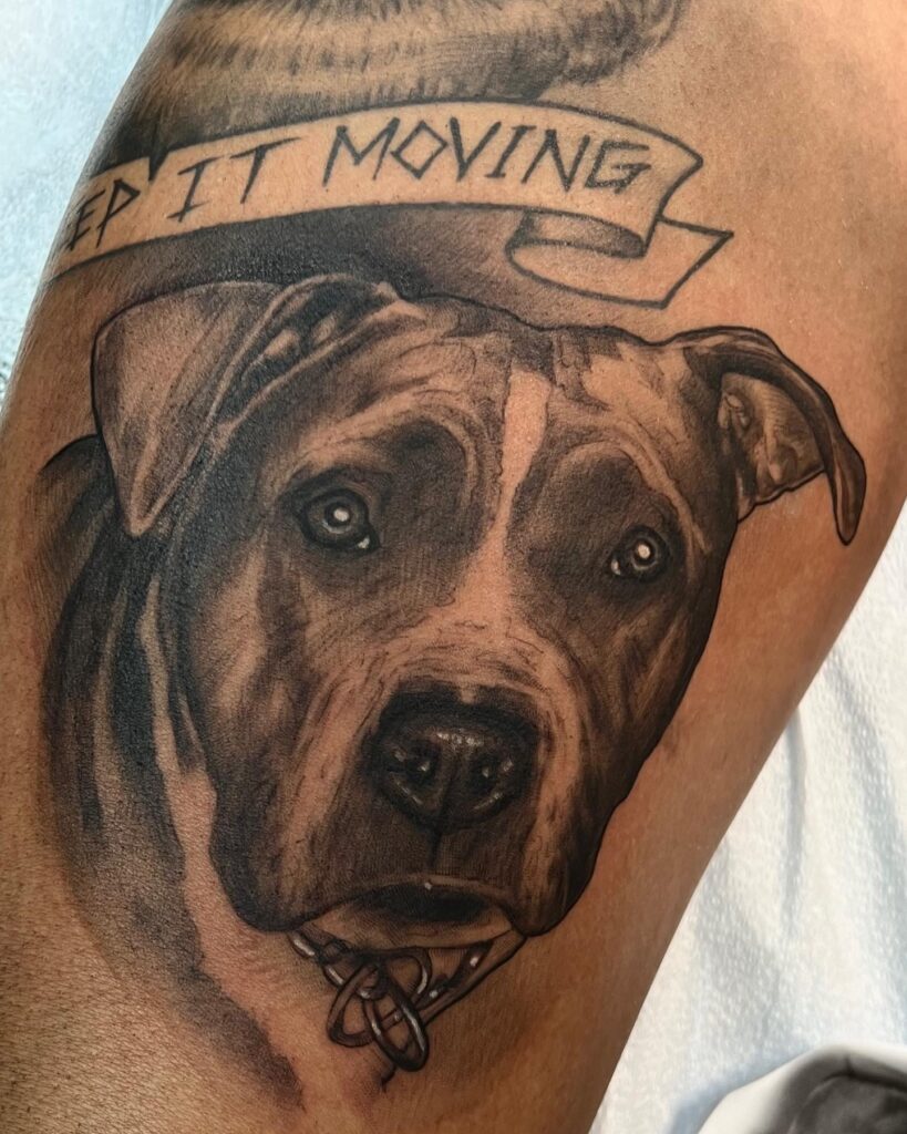 This tattoo features a hyper-realistic portrait of a strong and soulful dog, framed with incredible shading and detail. Above, a banner with the phrase “Keep It Moving” adds motivational significance, blending personal meaning with tribute. The lifelike eyes reflect loyalty and resilience, while the detailed muzzle showcases the artistry behind the piece.