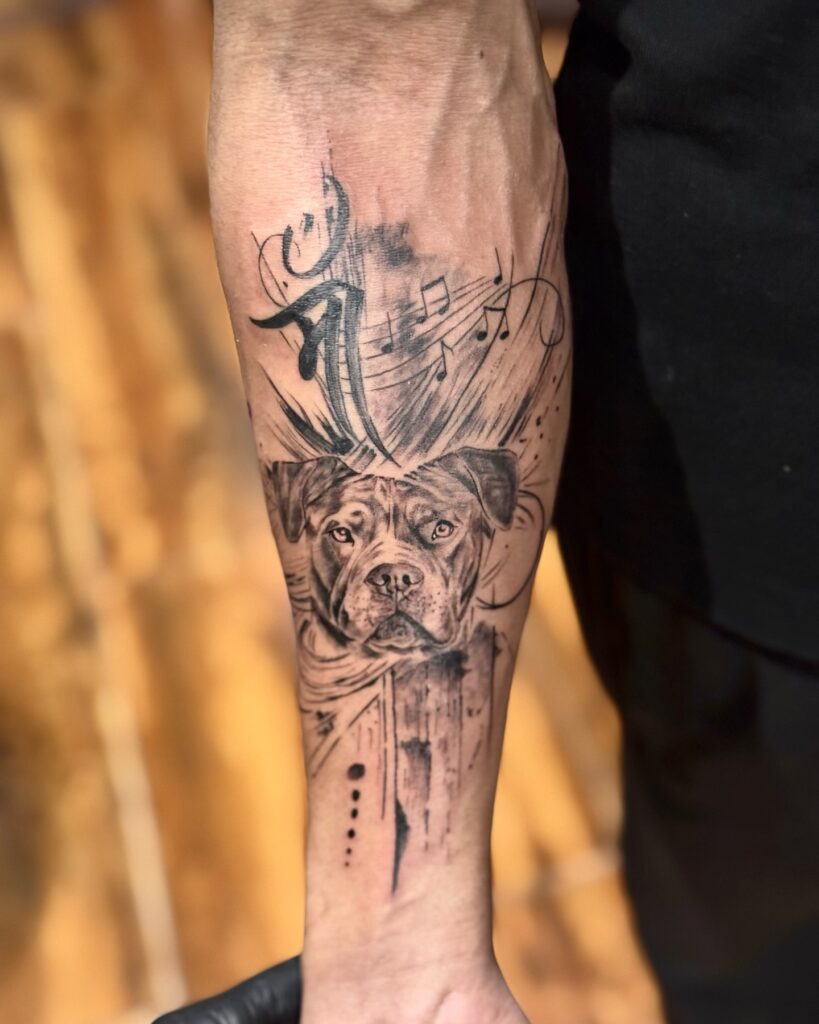 This tattoo brings together realism and abstract art, featuring a striking dog portrait beneath a cascade of bold brushstrokes and flowing musical notes. The combination of detailed shading and expressive artistic strokes symbolizes both individuality and creativity.