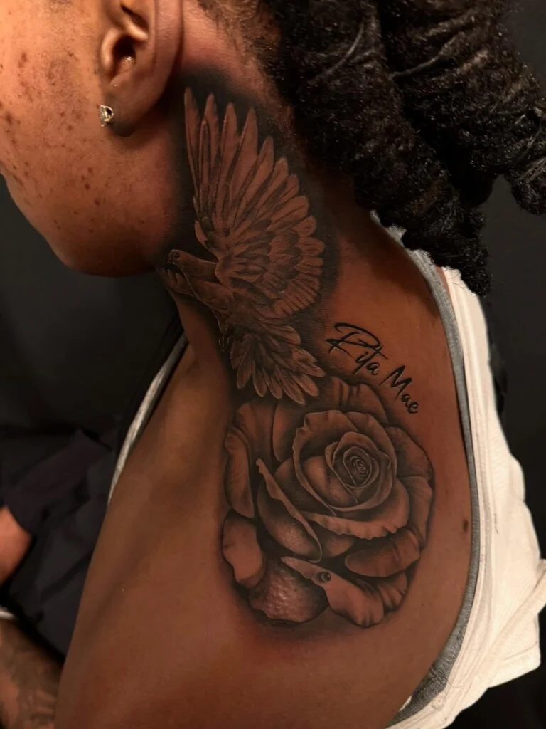 This design beautifully merges a flying dove with a large, realistic rose blooming across the shoulder and neck. The petals are intricately shaded, and a name inscription adds a personal touch, likely serving as a tribute to a loved one. The overall composition flows naturally with the body’s shape.