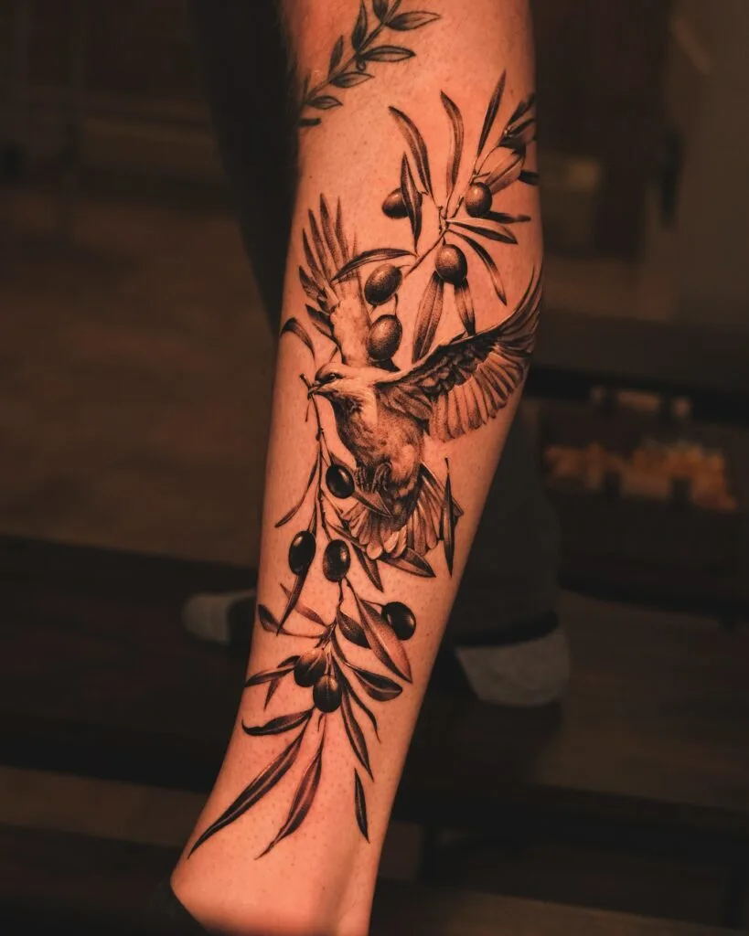 The olive branch traditionally symbolizes peace and reconciliation, making this tattoo a strong emblem of hope and resolution. It can represent forgiveness, overcoming conflict, or a desire for harmony in one’s life, blending nature-inspired artistry with powerful personal meaning.