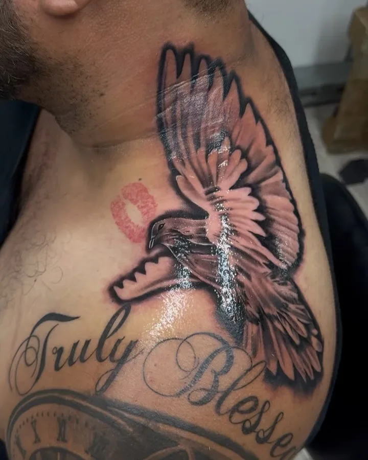 This shoulder and neck tattoo showcases a photorealistic dove mid-flight with beautifully detailed feathers and strong contrast shading. The surrounding lettering, “Truly Blessed,” adds to the meaning, making the design both artistic and personal. The placement flows over the shoulder muscles naturally.