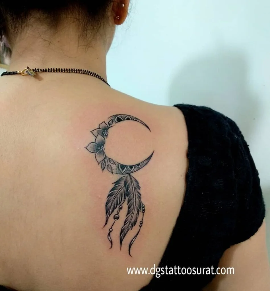 At the center, a crescent moon adds a mystical touch, combining celestial energy with traditional dream catcher symbolism. The harmonious placement on the back creates an eye-catching yet graceful statement, making it a powerful design for women who embrace beauty, balance, and spiritual strength.