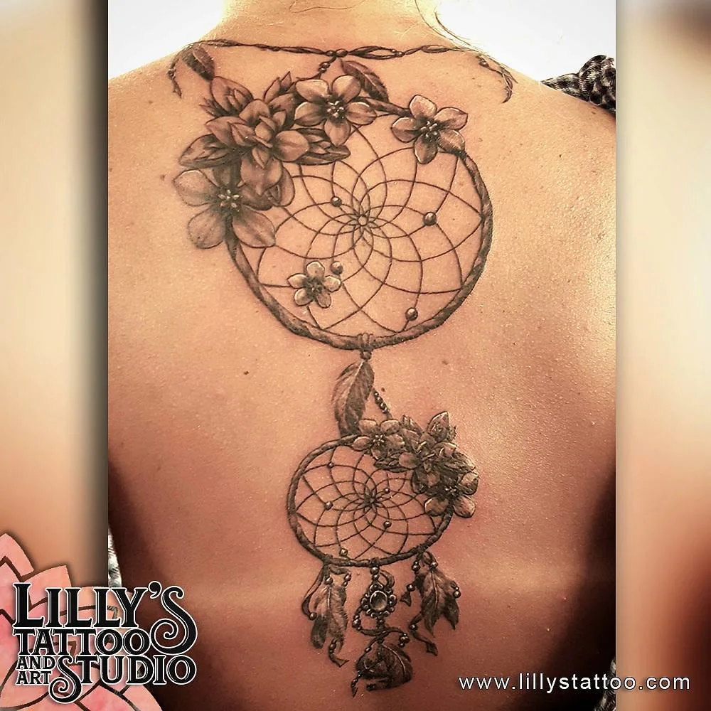 Stretching across the back, this tattoo showcases two dream catchers connected vertically, decorated with detailed flowers and cascading feathers. The delicate shading enhances the intricate webbing and floral accents, creating a sophisticated, large-scale design.