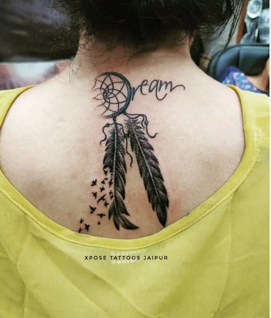 This upper back tattoo blends a small dream catcher with flowing script that spells “Dream.” The feathers are shaded in black, while tiny birds fly outward, symbolizing hope, freedom, and aspirations taking flight.