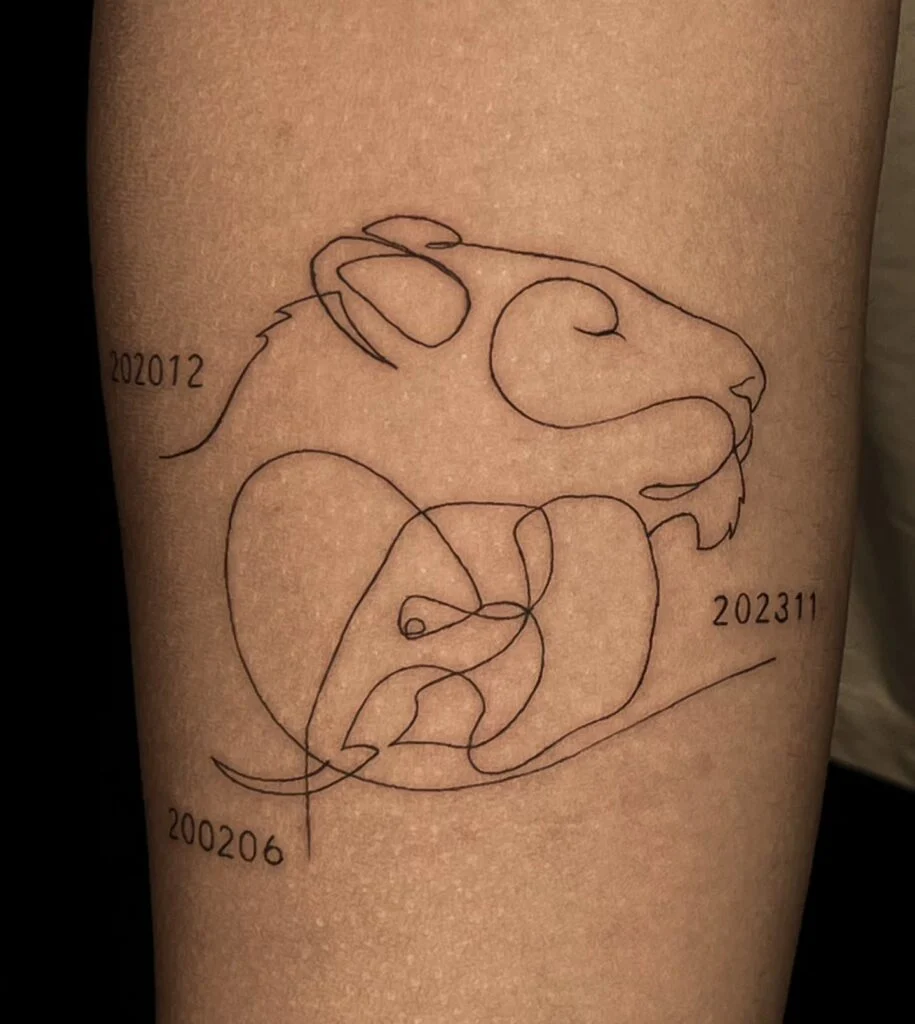 This deeply personal tattoo uses a continuous line to draw three lion profiles—adult, cub, and elder—seamlessly intertwined. The inclusion of dates next to each head suggests significant milestones or births, making this piece both a work of art and a family tribute.