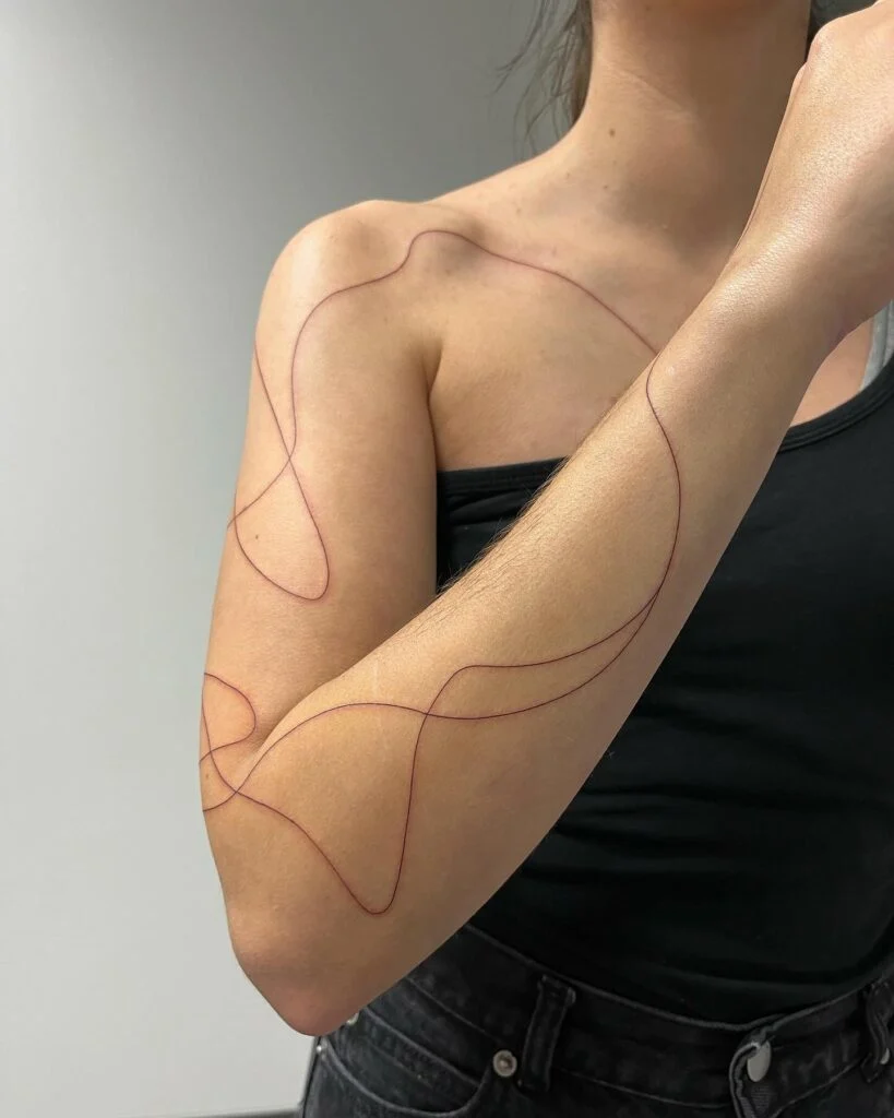 This ultra-minimalist design weaves a single fine line across the shoulder and arm, creating an elegant dance of curves and loops. The deep red ink makes the abstract shape stand out subtly against the skin.