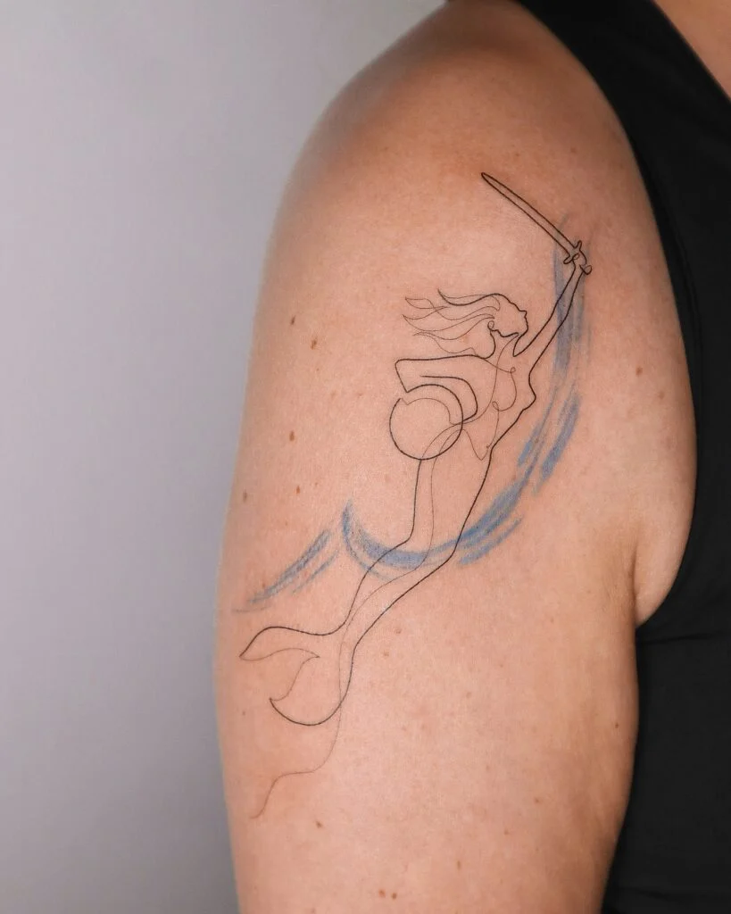 This bold single line tattoo captures the strength and fluidity of a mermaid warrior in a dynamic pose. Her form, outlined in one continuous stroke, holds a sword and shield as she swims upward through blue wave-like accents.