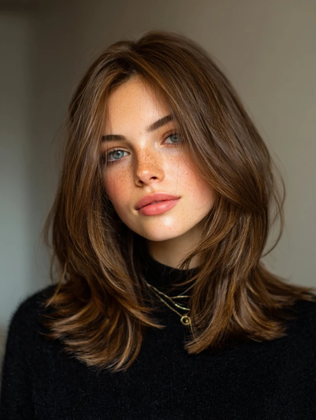 Why It Works: Layers add body while curtain bangs frame your face softly—effortless yet stylish.