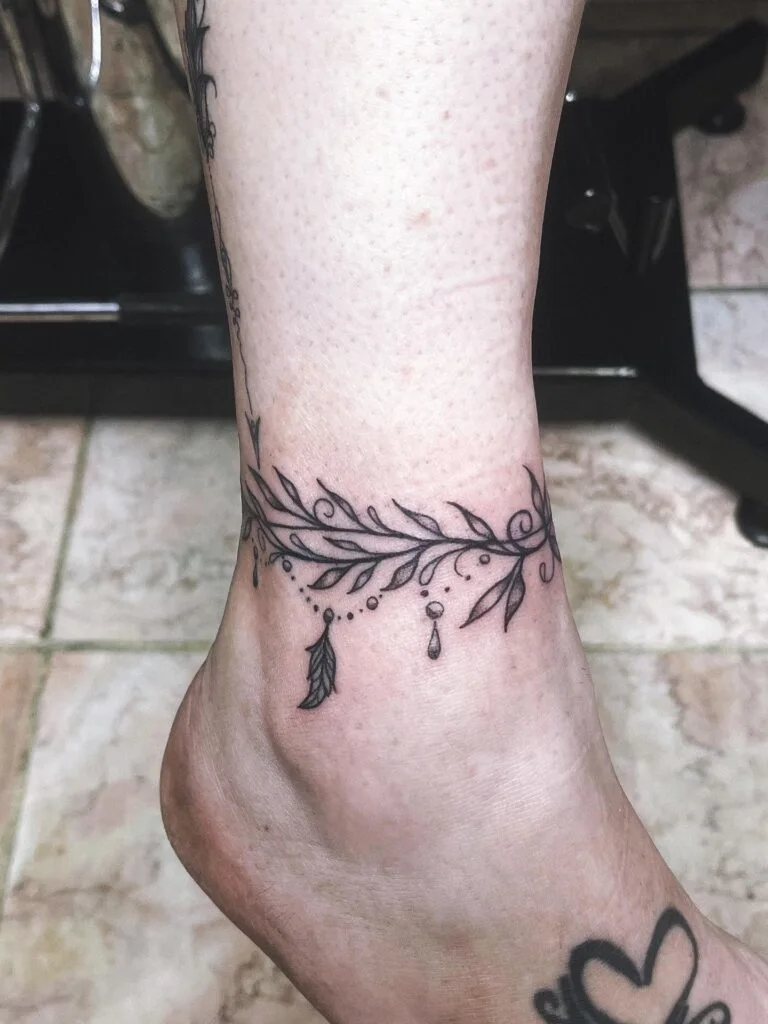 This ankle tattoo captures the beauty of nature with leafy vines wrapping delicately around the leg like an ornamental anklet. Intricate bead-like dots and dangling charms add a touch of elegance, while the small feather brings a sense of freedom and spirituality.