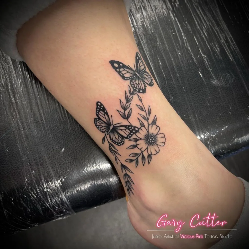Graceful and uplifting, this ankle tattoo showcases delicate butterflies fluttering around wildflowers and leafy accents. The black ink design combines fine line details with shading, creating depth and movement in the artwork.