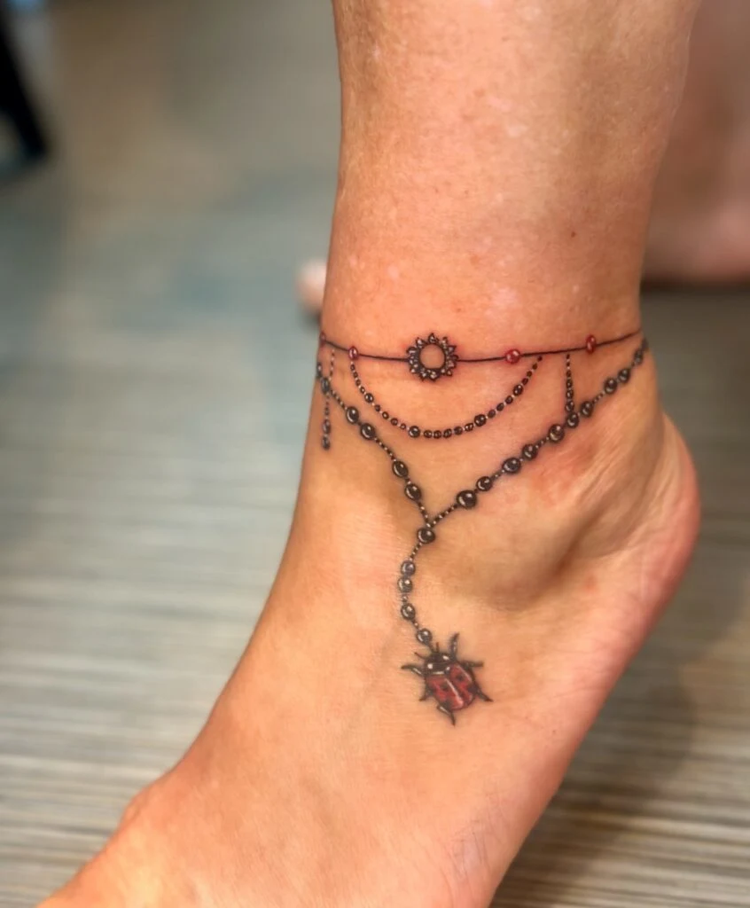Charming and intricate, this ankle tattoo resembles a beaded anklet, complete with delicate chains, ornamental beads, and a dangling ladybug charm. Touches of red ink add color and vibrancy, making the design playful yet stylish.