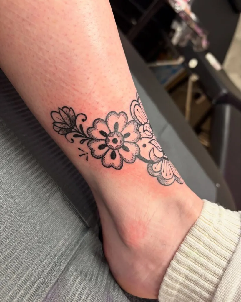 This floral ankle tattoo is striking and vibrant, featuring detailed blossoms connected in a band-like design. Its bold outlines and shaded accents bring depth to the petals, creating a piece that feels both strong and feminine.