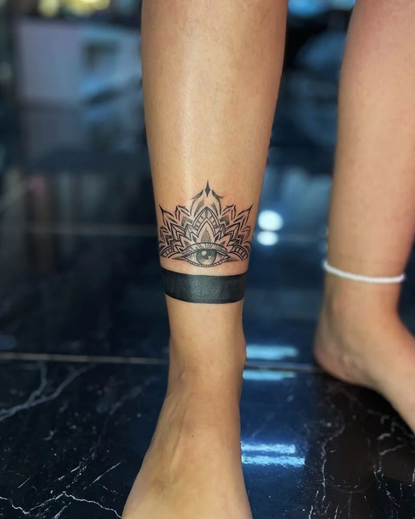 This ankle tattoo combines spiritual symbolism with striking design. Featuring a mandala-inspired crown above an all-seeing eye, it radiates mysticism and balance. The bold solid black ankle band beneath it grounds the composition, giving the tattoo weight and contrast.