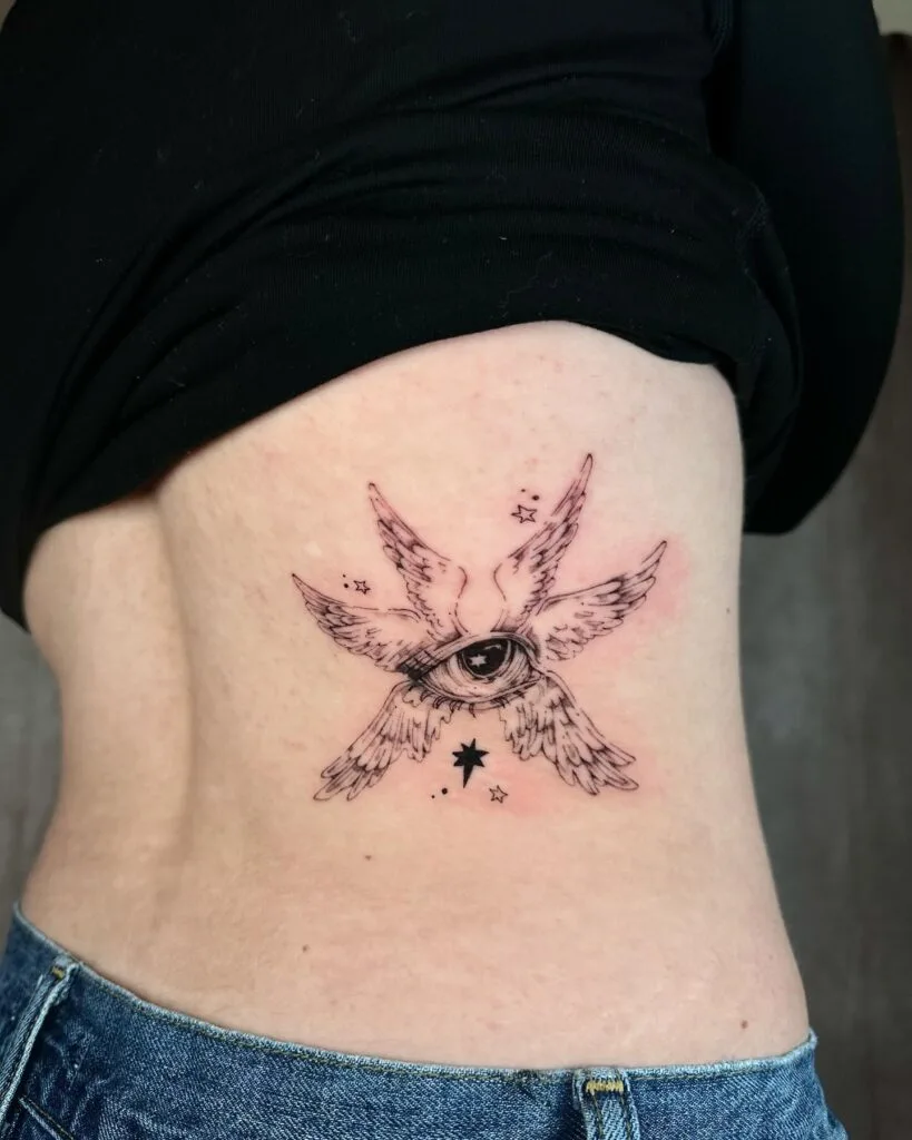 This breathtaking tattoo features an all-seeing eye nestled within the wings of an ethereal dove, symbolizing divine wisdom, intuition, and spiritual guidance. Stars and cosmic details add to the celestial aesthetic, making it a powerful and symbolic piece.
