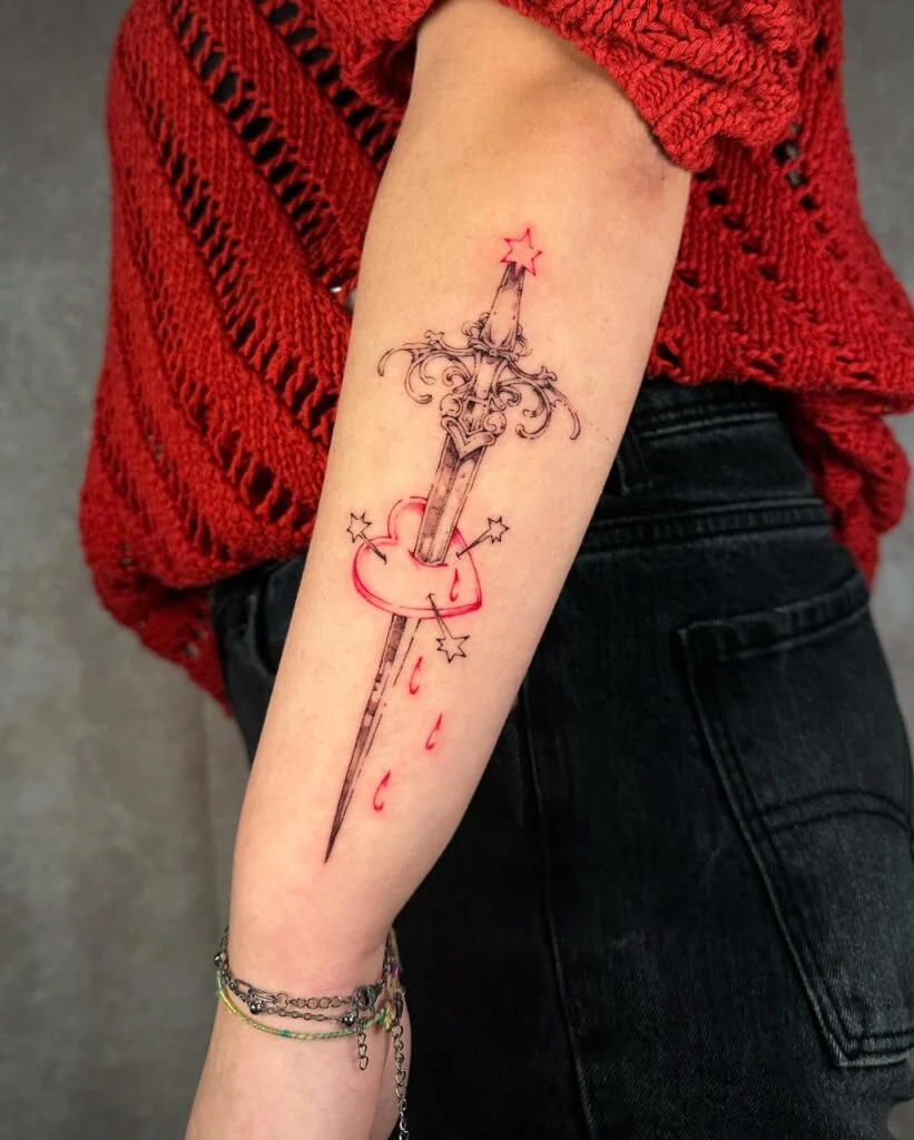 This intricate sword tattoo combines celestial and medieval elements, with a beautifully detailed hilt and a radiant star at the tip. A delicate pink aura surrounds the sword, while droplets of cosmic energy seem to fall from its blade.