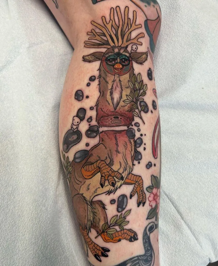 This enchanting tattoo features a mythical deer-like creature with an ancient aura, blending elements of folklore and fantasy. Its wise, expressive eyes and unique antlers give it a celestial presence, while small spirits float around it, adding to its ethereal charm.