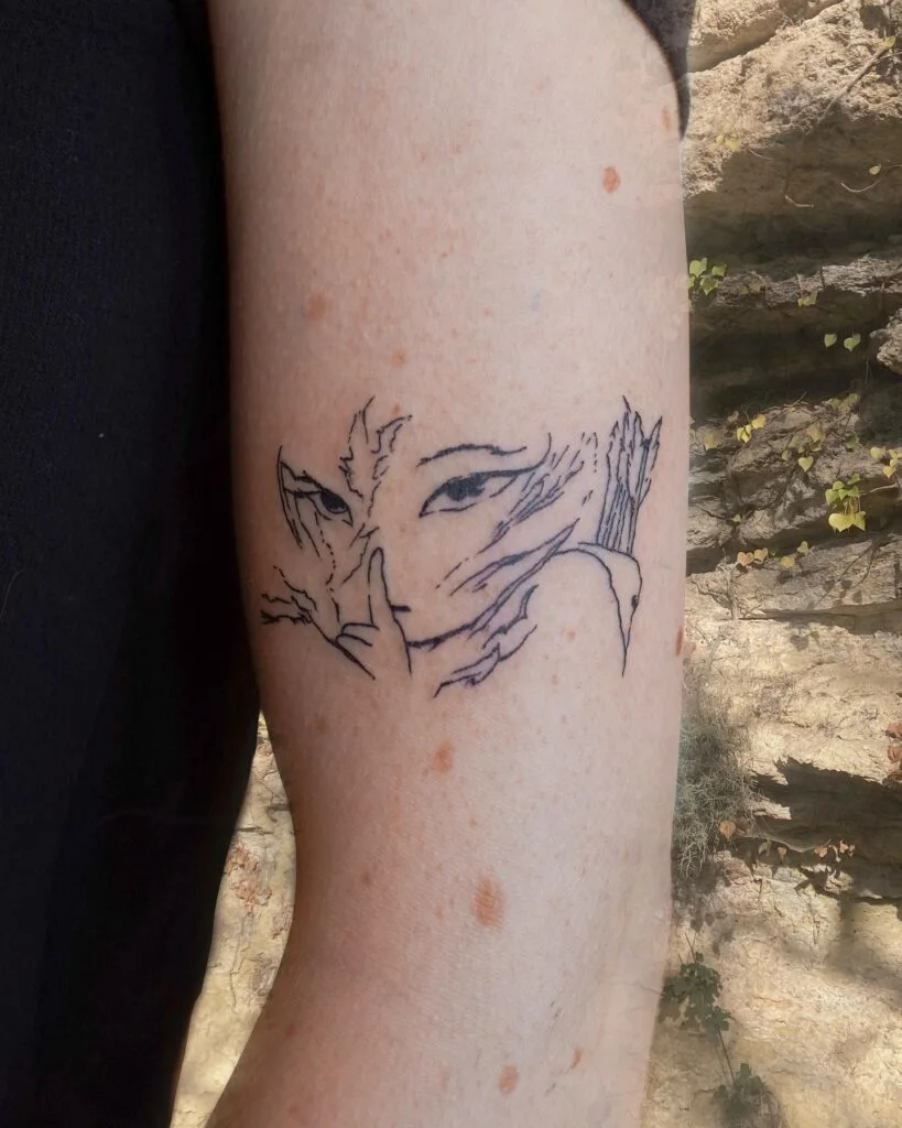 This mesmerizing tattoo illustrates a ghostly visage emerging from intertwining branches, evoking an ethereal and mysterious allure. The striking eyes peer through the organic lines, representing hidden truths, transformation, and the merging of nature with the spiritual realm.