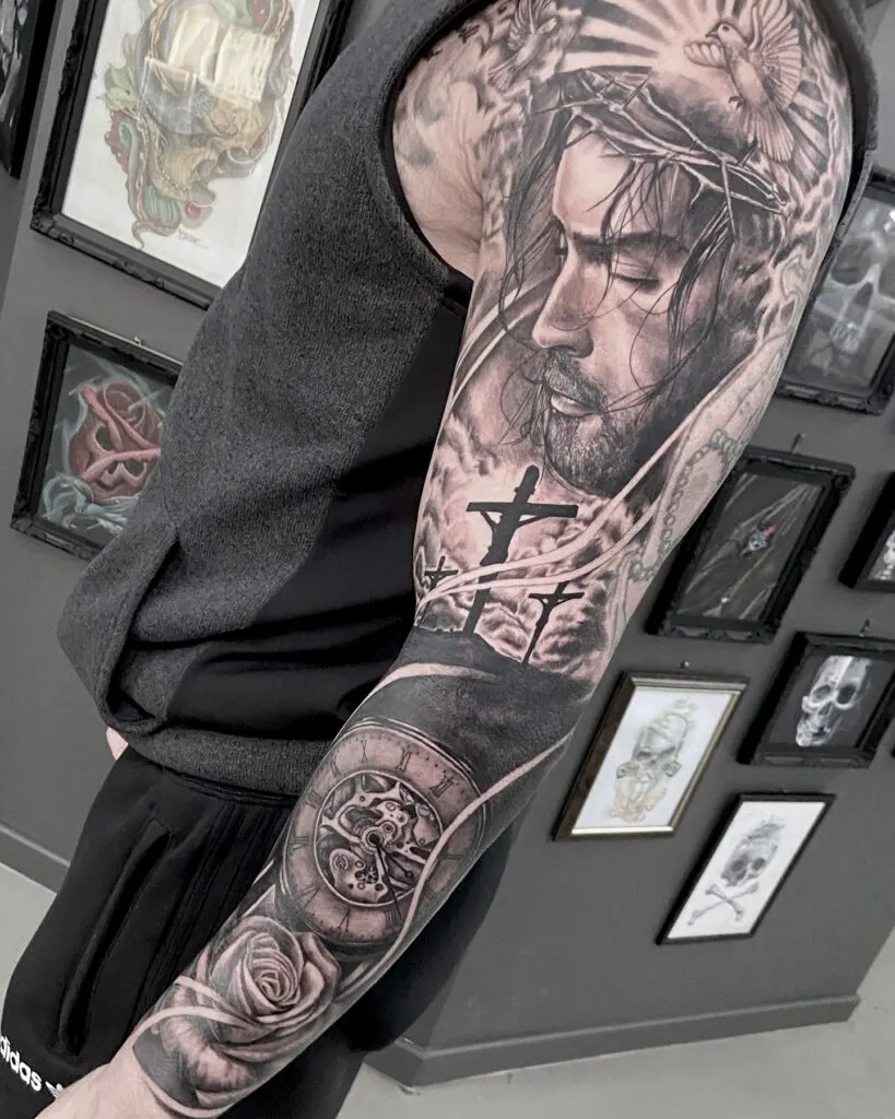 The timepiece often represents eternity or life’s fleeting nature, while the rose symbolizes love and sacrifice. The shading and realism create a visually stunning masterpiece, covering the entire arm with a narrative of devotion, suffering, and hope. This tattoo unites artistry and spirituality, making the wearer’s arm a canvas of faith and eternal remembrance.