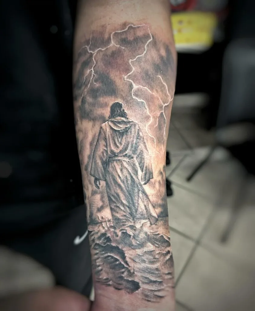 This forearm tattoo depicts Jesus from behind, walking into a storm with lightning cutting through the sky. The dramatic contrast between light and shadow symbolizes faith in times of chaos, portraying Christ as the eternal guide through life’s tempests.