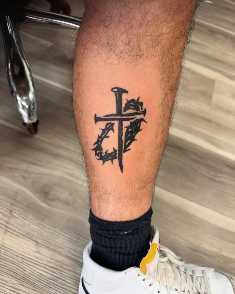 This calf tattoo depicts a simple yet striking cross encircled by a crown of thorns. The design recalls Christ’s crucifixion and the pain He endured for salvation. The minimalist approach, with sharp black outlines, highlights the powerful symbolism without unnecessary detail.