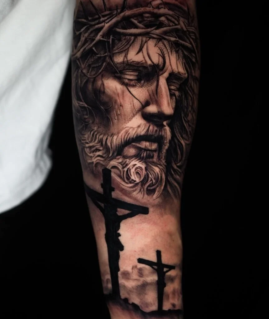 This forearm tattoo merges a sorrowful portrait of Jesus crowned with thorns and the three crosses of Calvary below. Tears etched into His face highlight the immense suffering endured, while the thorns symbolize sacrifice and redemption.