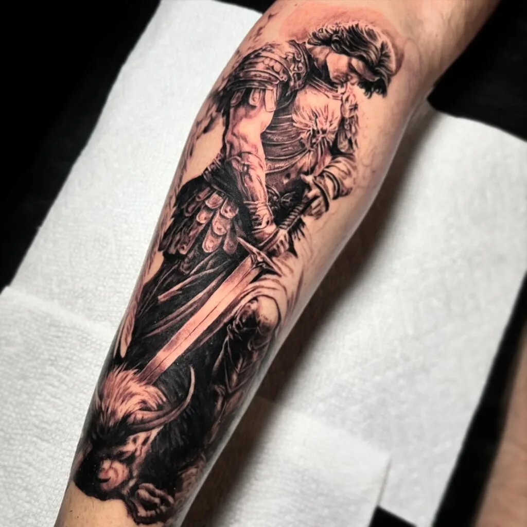 This tattoo powerfully portrays Archangel Michael, the heavenly warrior, in full armor with a sword poised in victory over evil. The detailed shading and lifelike composition emphasize his commanding presence, reflecting themes of justice, protection, and divine strength. At his feet lies the defeated demon, symbolizing triumph of light over darkness.