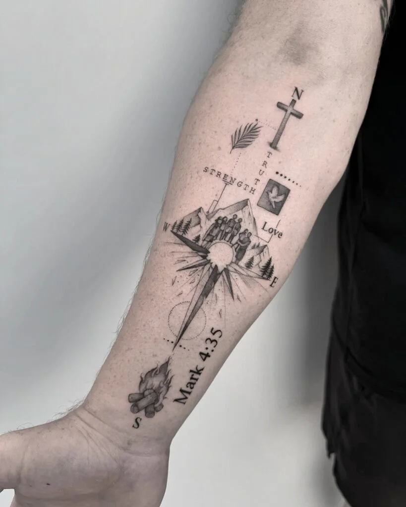This forearm tattoo combines a compass with Christian symbols, including a cross, a dove, and scripture reference Mark 4:35. The compass represents spiritual direction and guidance, pointing the wearer toward truth, strength, and love. The inclusion of the cross emphasizes faith as the ultimate guiding force, while the dove symbolizes peace and the Holy Spirit.
