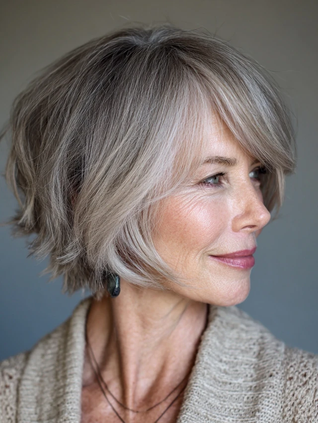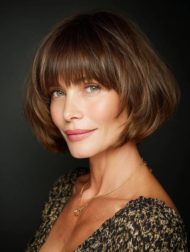 A feathered bob with fringe adds a soft front section that blends into the layered sides. The fringe enhances facial framing.