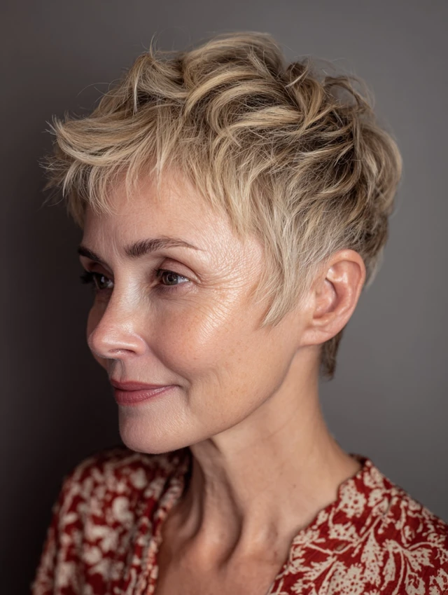 A feathered pixie cut uses light, tapered layers to create softness and lift at the crown while keeping the sides neat. The feathering adds flow.