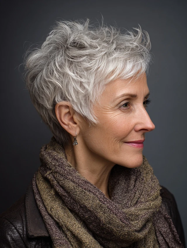 A feathered pixie bob blends short structure with slightly longer layers for movement. The feathering adds softness to the shape.