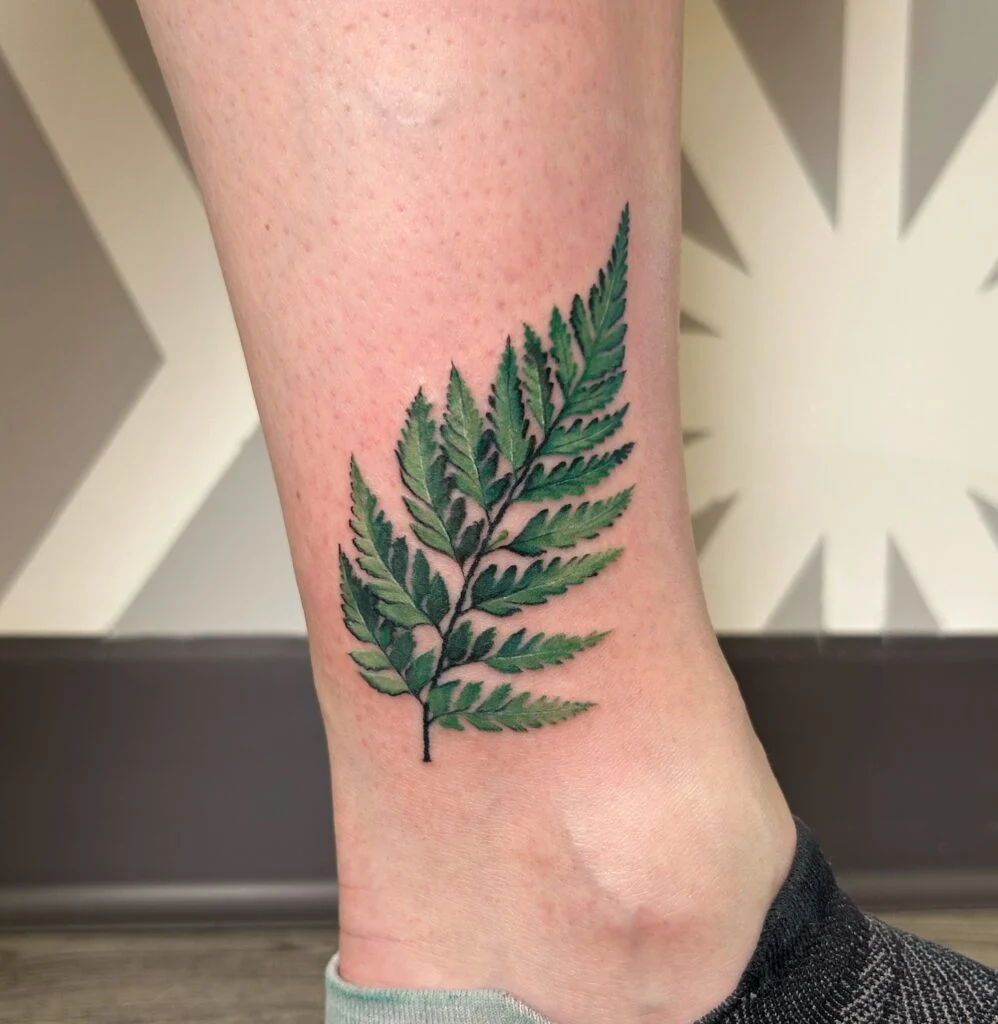 This ankle tattoo brings the fern leaf to life with rich shades of green, making it pop vividly against the skin. The realistic coloring adds depth and freshness, symbolizing vitality and renewal.